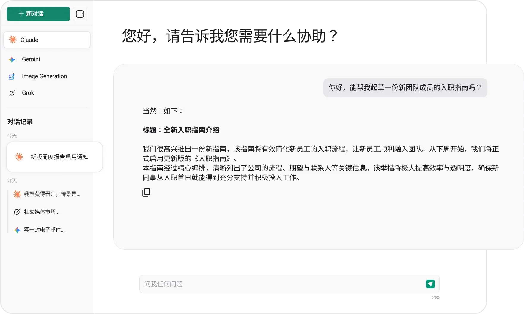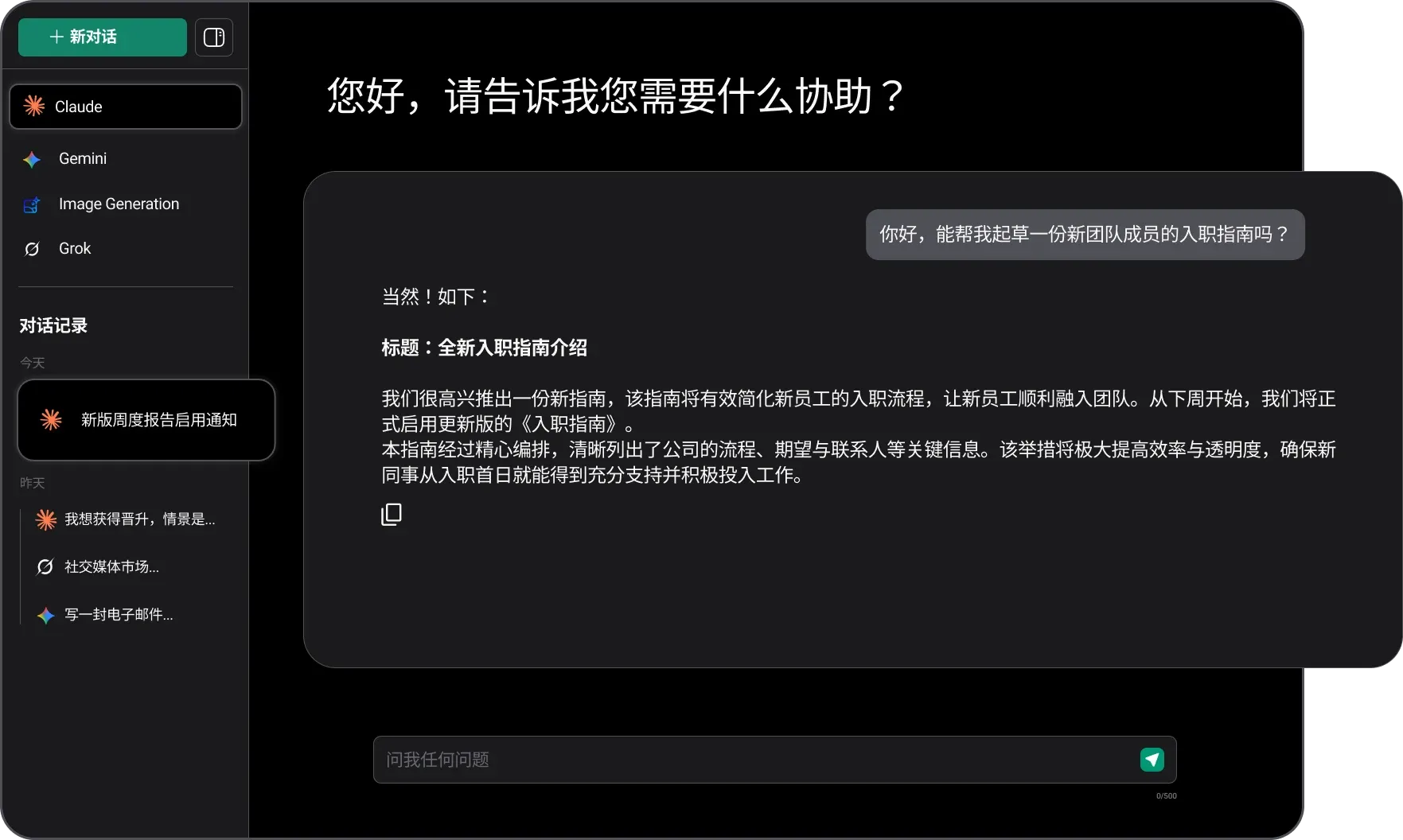 在一个平台上探索 AI 的世界。与不同模型对话,比较它们的优势,充分发挥 AI 技术的潜力。无论你需要准确的研究、内容创作、语言翻译、图像生成还是编码协助,我们都为你准备了合适的模型。