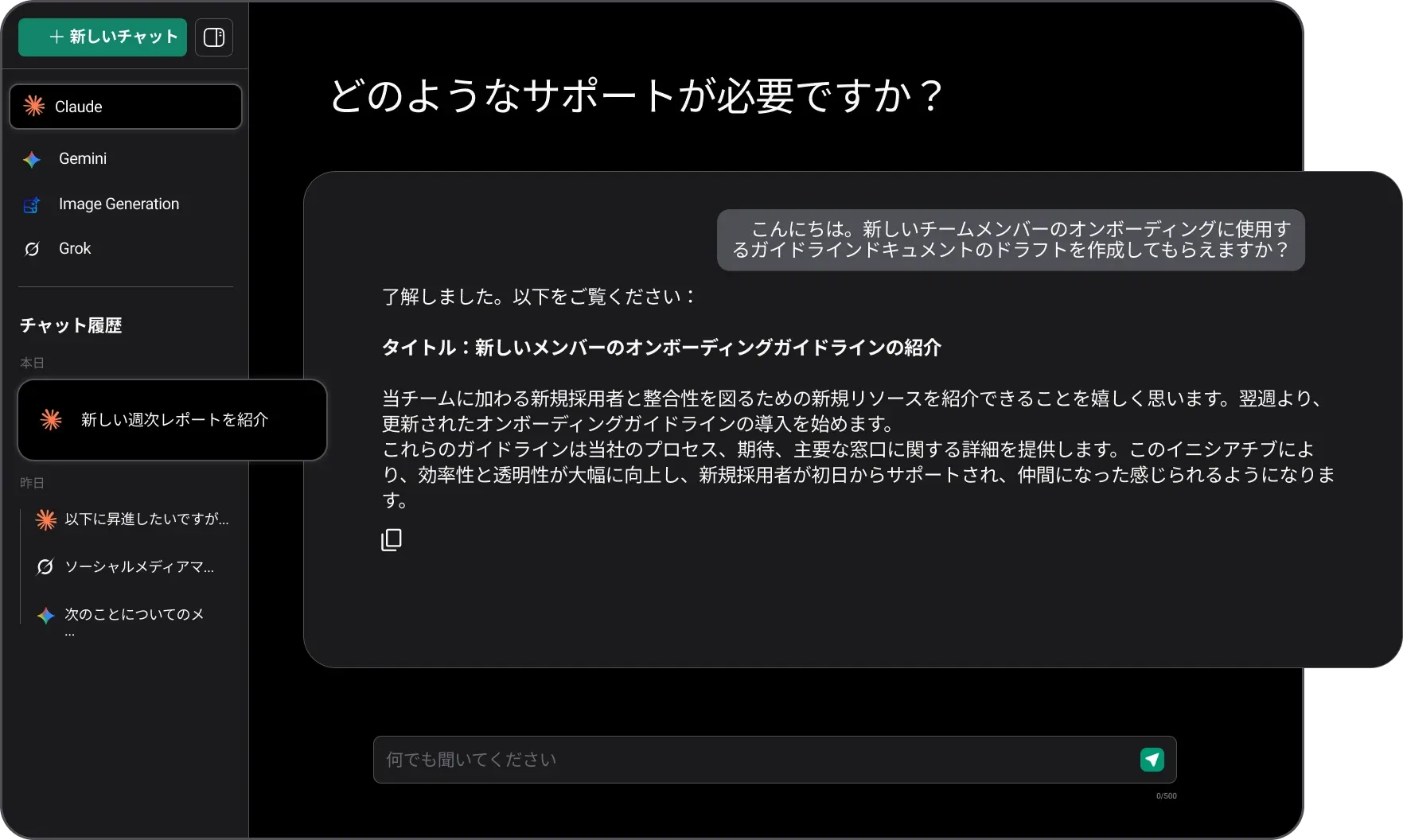 AI Chat は、最先端のAIを自然な対話フローで活用し、直感的で魅力的なチャット体験を提供します。カジュアルな会話でも課題解決でも、AI Chat は意味のある、ダイナミックで人間らしい対話の頼れるAI です。