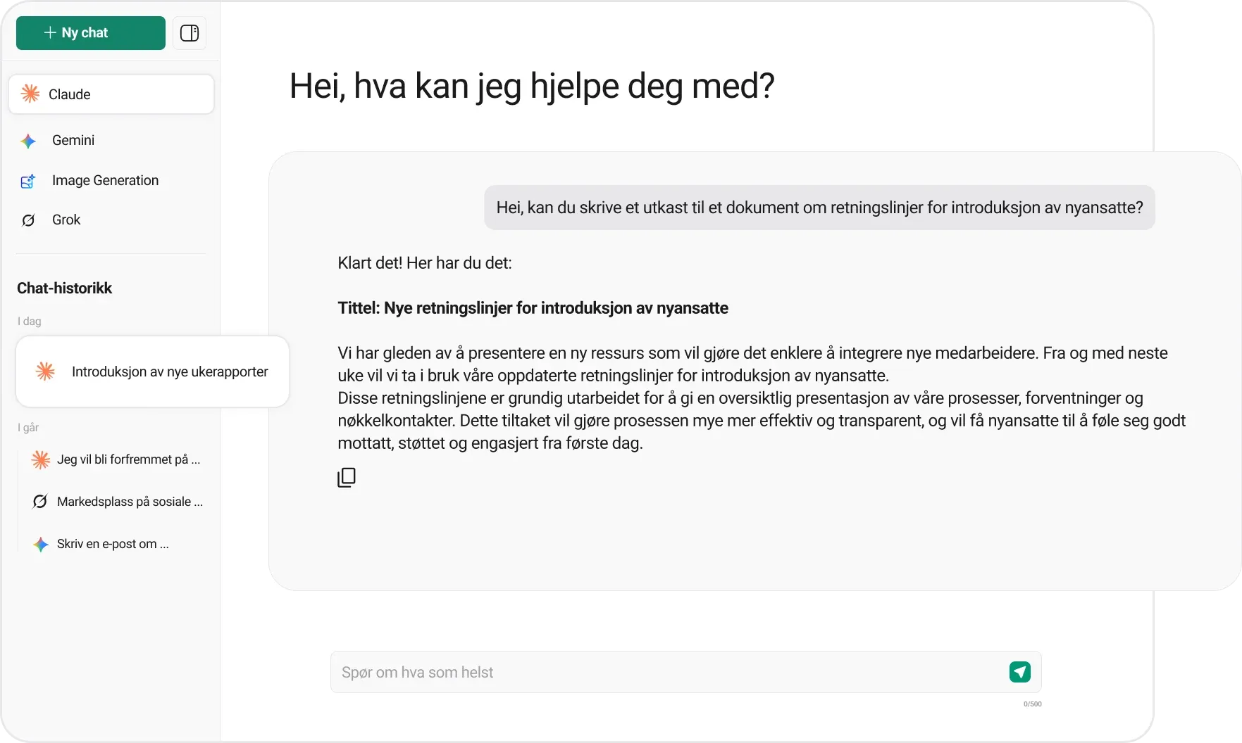 - Personalisering: Tilpass AI-opplevelsen ved å velge mellom ulike modeller som passer dine preferanser og krav.