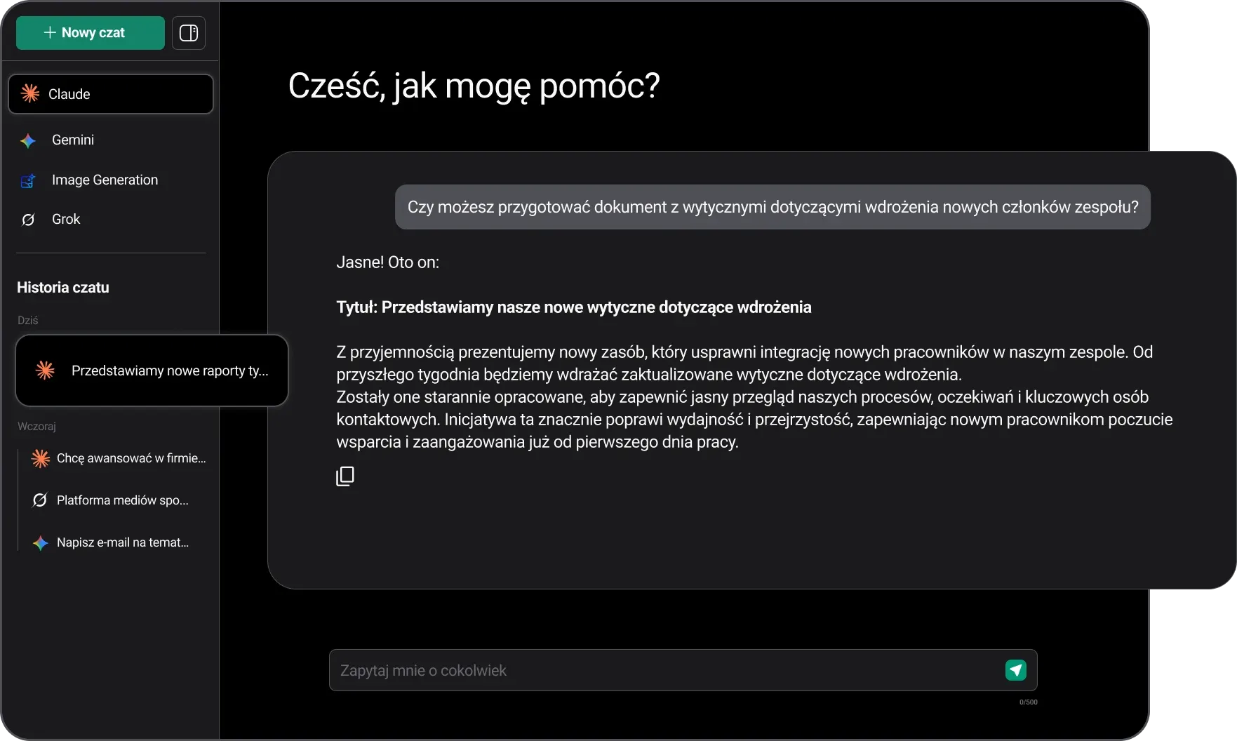 Odkryj świat AI w jednym miejscu. Porozmawiaj z różnymi modelami, porównaj ich możliwości i maksymalnie wykorzystaj potencjał technologii AI. Niezależnie od tego, czy potrzebujesz rzetelnych badań, tworzenia treści, tłumaczeń językowych, generowania obrazów czy pomocy w kodowaniu, mamy odpowiedni model dla Ciebie.